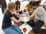 午後からは小菅村の小学生から中学生まで12人が参加しての交流キャンプを行いました。自己紹介の名刺交換ゲームの後、三地域の参加者が、それぞれのゲームを紹介。言葉は通じなくても、大いに盛り上がりました。その後ドッジボールでの対抗戦を行ってから、テントを張りました。夕食で塩焼きにするために、マスの串刺しにも挑戦しました。