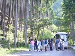 堆肥になるまでの作業を一人で担当されていることに参加者は驚き、そのことによって、自分たちの気づいていないところで、様々な人たちの努力があることに気づき、参加者たちの姿勢が変わっていきました。最後は守重さんの森で間伐体験を行い、のこぎりに四苦八苦しながらも、協力してヒノキの木を切り倒しました。切ったばかりのヒノキの香りと、しっとりした切り口に驚いていました。小菅村の人たちの、自然を守る取り組みの現場を見ることができ、参加者にとって貴重な学びの場となりました。
