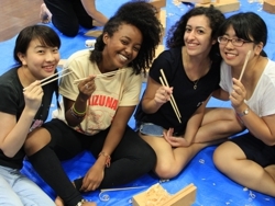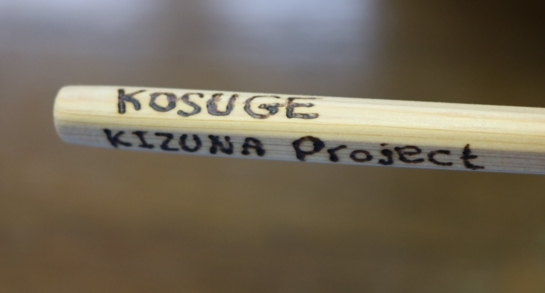 午後は、新聞紙バックと箸づくりを行いました。折り紙の技を使って作った新聞紙バッグを使えば、リサイクルとレジ袋の削減に貢献できるということで、自分のコミュニティにもどってからできることの一つになります。間伐材を使っての箸づくりも、小菅伝統の箸の作り方で、間伐材を有効に使う試みです。多摩源流こすげの寺田さんの指導で挑戦。かんながけが難しかったようですが、試行錯誤して頑張っていました。最後の仕上げは、焼きペンで、参加者それぞれ、思い思いの絵や文字を書きました。