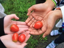とりたてのトマト、きゅうり、なすなどの野菜もその場でいただき、心をこめて、畑で野菜を作っていらっしゃる守重さんの思いにふれました。午後は、そば粉のせんべい作りを体験しました。生地を丸める、焼型で焼く、焼印を押すという工程です。お土産にするために、パッケージ作りもしました。袋につける折り紙を折ることも、楽しみながら取り組んでいました。