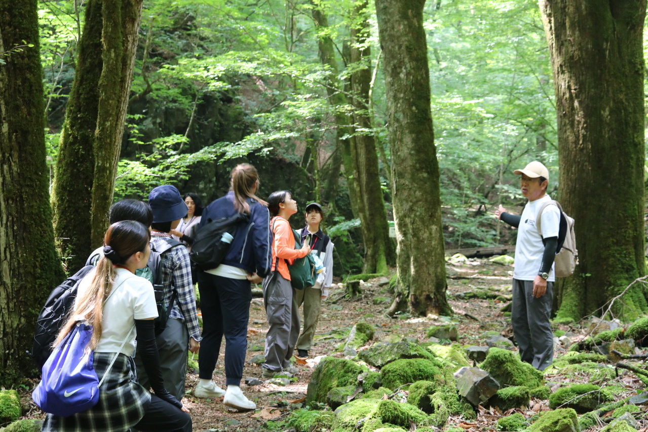 NPO法人源流みらいの佐藤英敏さんに、多摩川源流の森を案内していただきました。豊かな自然の森を歩きながら、様々な木のことを教えていただきました。小菅村の水が多摩川を流れて東京都民の飲み水になっていることから、小菅村の森の一部は、東京都水道局が管理する水源林になっていること、そのために、上流域の小菅村と下流域の東京都のつながりが深いことを教えていただきました。東京に住んでいる参加者は、日頃飲んでいる水が小菅村から来ていること、自分たちが飲んでいる水のために、小菅村が森の保全に取り組んでいることを知り、驚いていました。雄滝まで歩き、滝の水しぶきを浴びながら、豊かな森と清流を体で感じることができました。