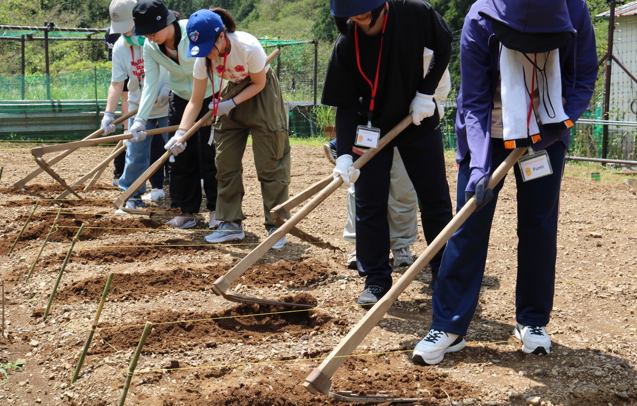 午前中、長作地区を歩きながら、前日の里山講座で学んだ里山の暮らしや知恵、森の現状や獣害などの課題を確認しました。守重敏夫さん、廣子さんご夫妻の畑に到着後、そばまきを体験しました。KIZUNAプロジェクトが始まって以来代々の参加者がそばの実を撒いては収穫し、つながりを受け継いできたそばの実です。くわを使うのも初めてで、畝を一本作り、種子をまいて土をかぶせていく作業を体験し、その大変さを実感しました。ご夫妻が丹精込めて育てた野菜が、7月の雹で大きな被害を受けた話を聞き、野菜作りの大変さを知りました。また、自然の堆肥を使い、手で虫を取って野菜を育てている廣子さんの話に、野菜作りに対する愛情を感じ、自然にも人にも