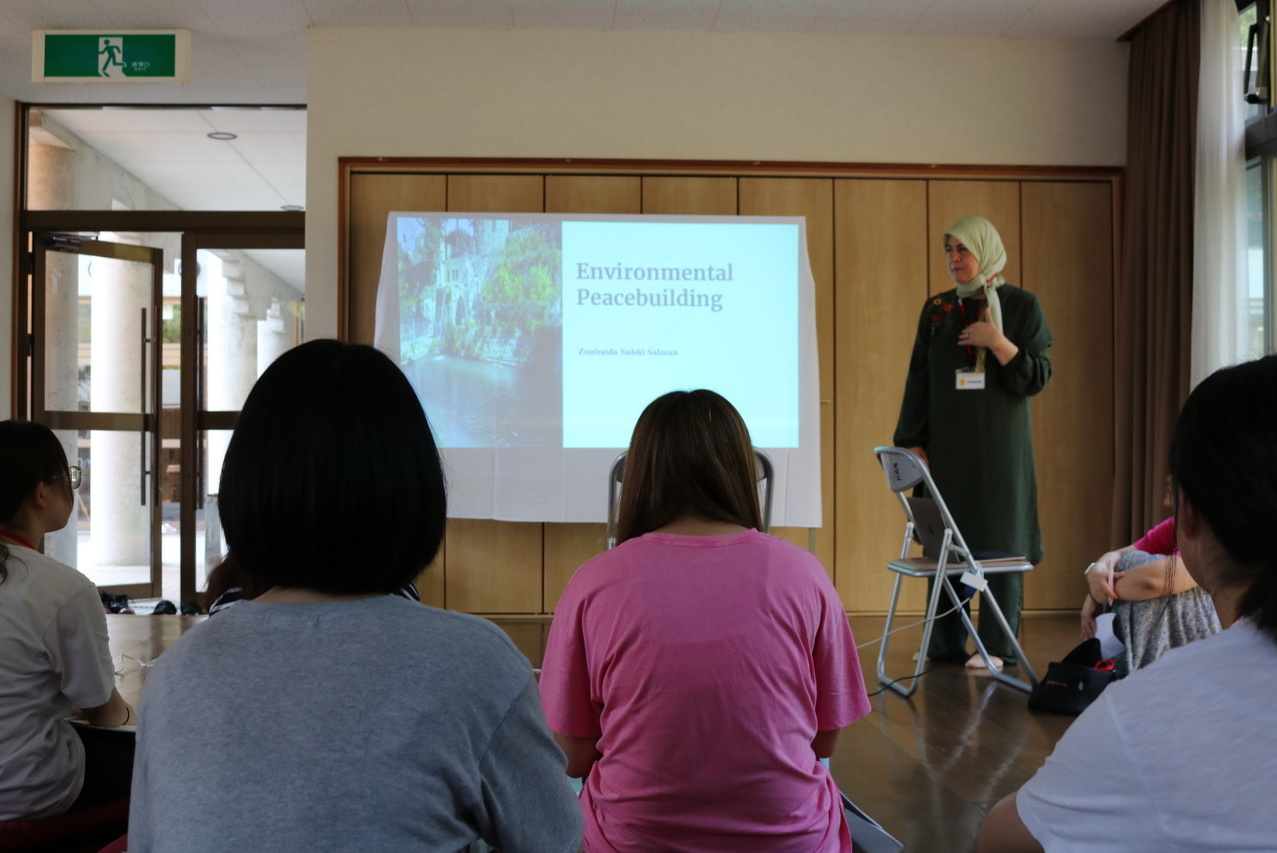 午後は、パレスチナで長年にわたり環境による平和構築の活動をしてきたズバイダ先生が、「環境による平和構築活動」について講義をしてくれました。パレスチナの環境、暮らし、文化、伝統、アイデンティティなど多岐にわたる話から、環境や土地が与えてくれる恵みに価値を見出し、人々が共に守ることで、持続可能なライフスタイルと平和がもたらされることを学びました。続いて、午前中の体験活動とズバイダ先生の講義から学んだことをさらに深めるTAIWAを行いました。