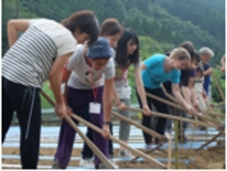 午後は、オリエンテーリング方式の長作集落ウォークラリーで、グループにわかれて渡された地図を頼りにいくつかのポイントをまわりました。待機していたボランティアスタッフが、午前中の里山講座の内容をもとにした質問をし、ポイントを競うもの。参加者たちは、グループで相談しながら答えを見つけ、集落を駆け抜けていました。そして、毎年お世話になっている守重敏夫さん、広子さんご夫婦の畑でそばの種をまきました。鍬で畝を作り、元気に芽が出るように大切に種をまき、土をかぶせる、という畑作業です。まいたそばは、2014年の参加者が蒔いてボランティアスタッが収穫したものです。秋に日本人参加者とボランティアスタッフが収穫し、2016年の参加者につなぎます。とりたての野菜もその場でいただき、心をこめて、畑で野菜を作っていらっしゃる守重さんの思いにふれました。
