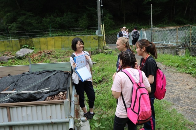 役場の守重さんの案内で、小菅村の環境を守る取り組みについて学びました。白糸の滝で、滝にまつわる昔話を聞き、きれいな森と水を感じました。下水処理場では、多摩川の源流にある小菅村の責任として、下水を完全に浄化した水を川に戻している過程を見せていただきました。参加者たちは汚泥の匂いに顔をしかめつつも、その取り組みに感銘を受けていました。間伐された森が見える場所で、中川さんから小菅村の森林とその課題、取り組みについて説明していただきました。間伐は森を維持する上で必要なことであるにも拘わらず、労力と経費がかかってしまうため、人口減少と高齢化が進んでいる中では、企業の支援が不可欠だという現状に、特に日本人参加者からたくさん質問が出ました。午後は、林業廃棄物センターで、細川さんが、生ゴミを堆肥にして袋詰めするまでの全工程を、一つ一つ詳しく説明してくれました。その日の朝食で出た生ゴミをかくはん機に入れさせていただき、普段考えることもなかった、自分の出したゴミの行方を目の当たりにし、生ゴミを堆肥にすることでリサイクルになることを学びました。これらの作業を細川さんが一人でやっておられることに大変驚き、自分たちの知らないところで、環境を守るために働いてくださっている方がいることに感謝するしかありませんでした。その後、守重さんの森で間伐体験。慣れないノコギリを使う作業に、間伐が大変な作業であることを実感しました。"がんばれ"の声がけの中、交代で2本のヒノキを切りました。木が倒れそうな時は互いに声をかけあい、記念に持って帰るために倒した木を輪切りにする時は、協力しあっておさえるなど、参加者同士の絆が深まっていく様子が伺えました。