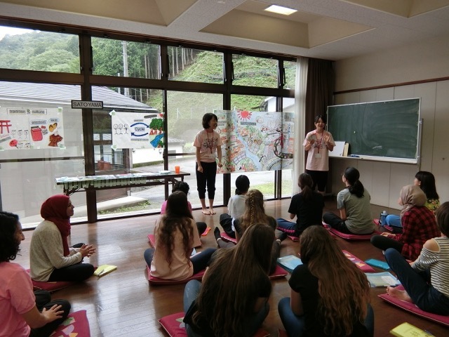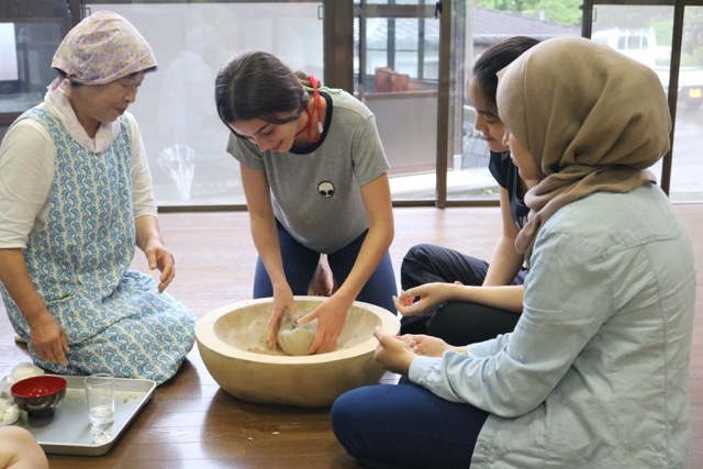 午前中は、新聞紙を利用しての新聞紙バッグ作り。目に見えるリサイクルとレジ袋削減の実践として、行動計画に取り入れる参加者も多かったです。午後は、小菅中学校が全校をあげて受け入れてくださっての交流プログラム。今年で3回目となりました。中学3年生が、小菅村や日本文化について英語で紹介した後、「ソーラン」を披露。橋立のお祭りで子どもたちが披露していたのを覚えていて、飛び入り参加する参加者もいました。とても気に入り、2日間の特訓でマスターしたほどです。その後、今回は、日本の伝統食である餅を通しての交流となりました。中学生が考えてくれた様々な餅の味を体験。あんこ、きなこ、磯辺焼き、ずんだなどいろいろなお餅の食べ方があることを知りました。教頭先生に案内いただいての校内見学は、イスラエルやパレスチナの学校とまったく違う日本の学校に興味津々でした。